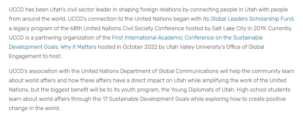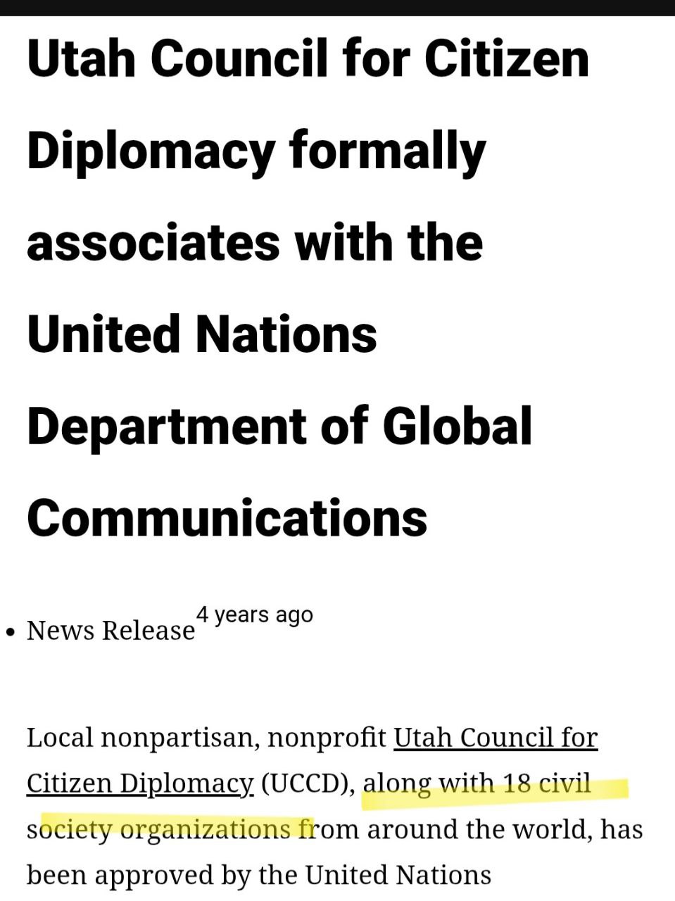 An article shared on Liberty Sentinel, set out the timeline for a CSO registered under the United Nations NGO branch by the name of Utah Global Diplomacy (UGD). This UN NGO (I’ll call them all NGOs for this article) is, or was, until September 10th 2025 at least, tied to the State Department. They have promoted international connection and cooperation. They have promoted exchange programs and immigration. They have been tied into the “global diplomacy” agenda.